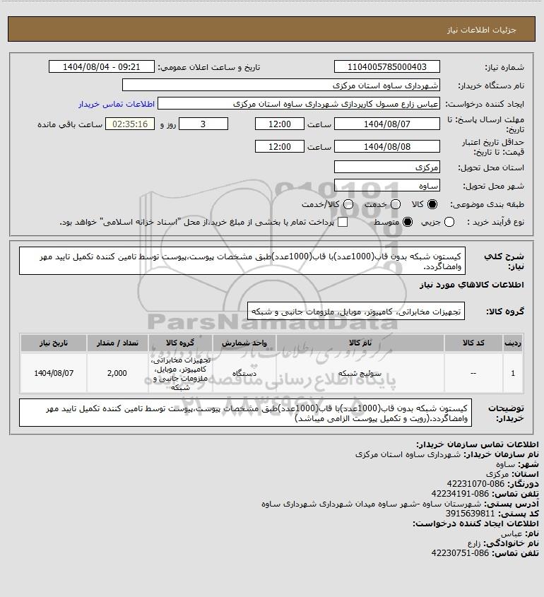 توضیحات خریدار:کیستون شبکه بدون قاب(1000عدد)با قاب(1000عدد)طبق مشخصات پیوست،پیوست توسط تامین کننده تکمیل تایید مهر وامضاگردد.(رویت و تکمیل پیوست الزامی میباشد)