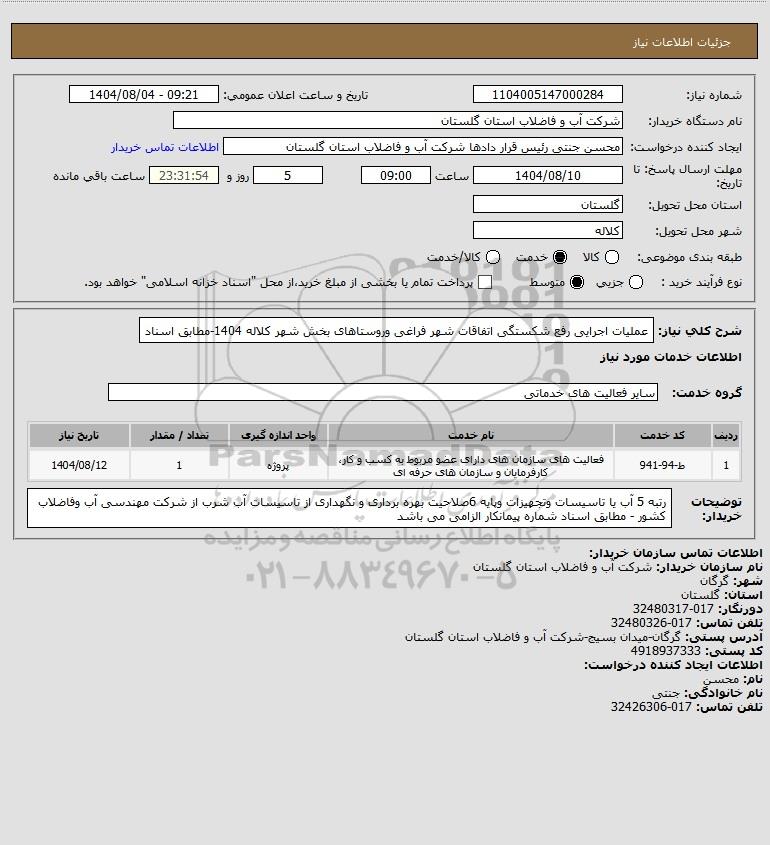 شرح کلی نیاز: عملیات اجرایی رفع شکستگی اتفاقات شهر فراغی وروستاهای بخش شهر کلاله 1404-مطابق اسناد