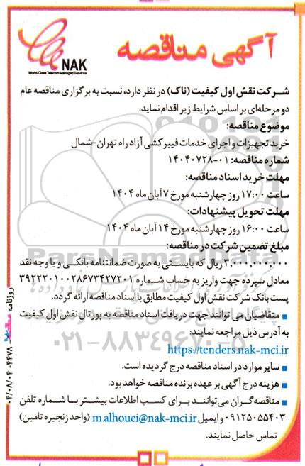 مناقصه خرید تجهیزات و اجرای خدمات فیبر کشی آزاد راه تهران - شمال از کلیه افراد متخصص و شرکتها واجد شرایط دعوت به عمل میآید در مناقصه با کد خبرگزاری پارس نماد: 9751699 شرکت نمایند.