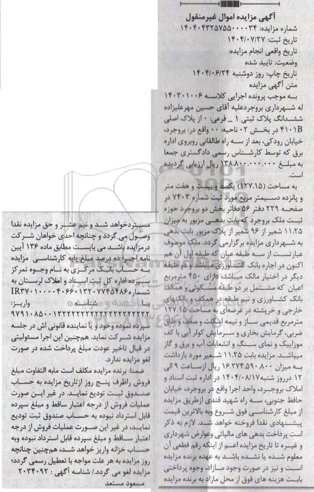 به موجب پرونده اجرائی کلاسه 140301006 له شهرداری بروجرد علیه آقای حسین مهر علیزاده ششدانگ پلاک ثبتی 1 - فرعی 0 از پلاک اصلی 4101B در بخش 02 ناحیه 00 واقع در بروجرد خیابان رودکی بعد از سه راه طالقانی روبروی اداره برق که توسط کارشناس رسمی دادگستری جمعا به مبلغ 138.800.000.000 ریال ارزیابی گردیده است. به مساحت (127.15) صد و بیست و هفت متر و پانزده دسیمتر مربع مورد ثبت شماره 7403 در صفحه 229 دفتر 56 دفاتر بخش دو بروجرد حوزه ثبت ملک بروجرد که بابت بدهی مزبور به میزان 11.25 شعیر از 96 شعیر از پلاک مزبور بابت بدهی به شهرداری مزایده برگزار میگردد ملک موصوف عبارتست از سه طبقه اعیان که طبقه اول آن هم اکنون در اجاره بانک کشاورزی میباشد و دو طبقه دیگر در اختیار مالک میباشد ، دارای حدود 450 متر مربع اعیان که مشتمل بر دو طبقه مسکونی و هم کف بانک کشاورزی و نیم طبقه در همکف و بالکنهای خارجی و خرپشته در عرصه ای به مساحت 127.15 متر مربع قدیمی ساز و نیمه اسکلت و سقف و طاق ضربی ، گرمایش بخاری و سرمایش کولر آبی با کف موزاییک و نمای سنگ و انشعابات آب و برق و گاز میباشد. مزایده بابت 11.25 شعیر مورد بازداشت به میزان 16.274.590.800 ،  ریال از ساعت 9 الی 12 در روز شنبه 1404.08.17 در اداره ثبت اسناد و املاک بروجرد واحد اجرا واقع در بروجرد خیابان حافظ جنوبی چهارراه شهید قندی از طریق مزایده از مبلغ پایه کارشناسی فوق شروع و به بالاترین قیمت پیشنهادی نقدا فروخته خواهد شد. لازم به ذکر است پرداخت بدهیهای مالیاتی و عوارض شهرداری و غیره تا تاریخ مزایده اعم از اینکه رقم قطعی آن معلوم شده یا نشده باشد به عهده برنده مزایده است و نیز در صورت وجود مازاد وجوه پرداختی بابت هزینه های فوق از محل مازاد به برنده مزایده مسترد خواهد شد و نیمعشر و حق مزایده نقداً وصول میگردد و چنانچه احدی خواهان شرکت در مزایده باشد میبایست مطابق ماده 136 آیین نامه اجرا ده درصد مبلغ پایه کارشناسی مزایده را بحساب بانک مرکزی به نام وجوه تمرکز سپرده اداره کل ثبت اسناد و املاک لرستان به شماره IR370100004066013207745486 با شناسه واریز 979108500122222222222222222222 سپرده نموده و خود یا نماینده قانونی اش در جلسه مزایده شرکت نماید همچنین این اجرا مسئولیتی در قبال تاخیر عودت مبلغ پرداخت شده در صورت لغو مزایده ندارد. ضمنا برنده مزایده مکلف است ما به التفاوت مبلغ فروش را ظرف پنج روز از تاریخ مزایده به حساب صندوق ثبت تودیع نماید در غیر اینصورت عملیات فروش از درجه اعتبار ساقط و مبلغ سپرده قابل استرداد نبوده و به حساب خزانه واریز خواهد شد. همچنین چنانچه روز مزایده به هر علت مواجه با تعطیل رسمی گردد؛ مزایده لغو میگردد.