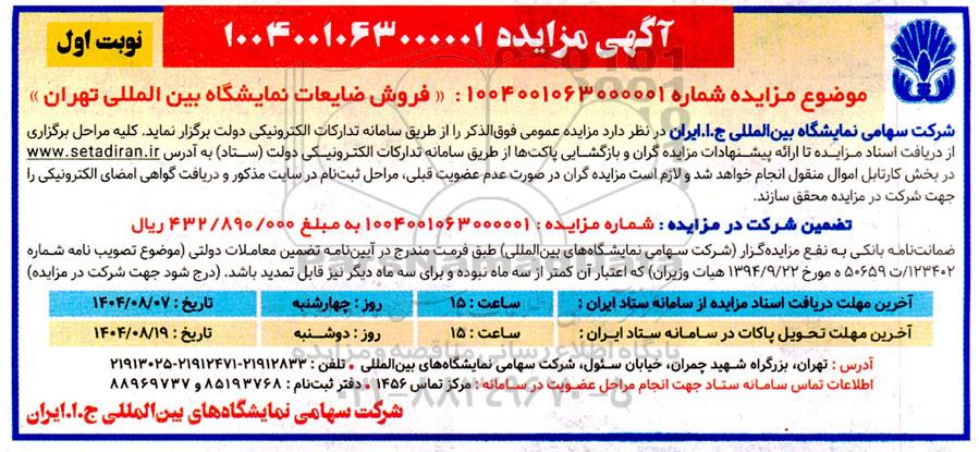 موضوع مزایده شماره 1004001063000001 : « فروش ضایعات نمایشگاه بین المللی تهران »