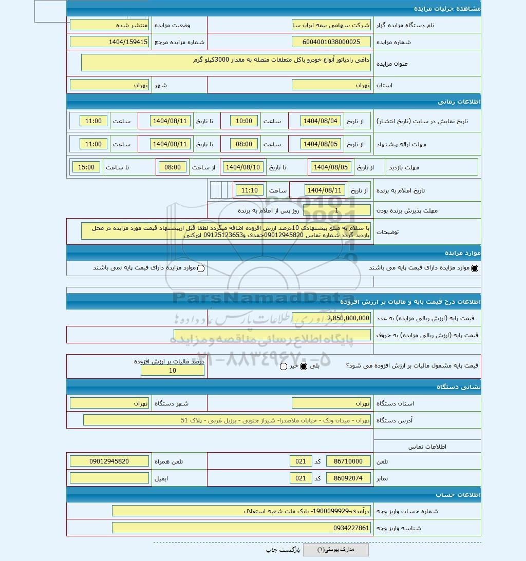 | نام دستگاه مزایده گزار | شرکت سهامی بیمه ایران ساختمان مرکزی | وضعیت مزایده | منتشر شده | |