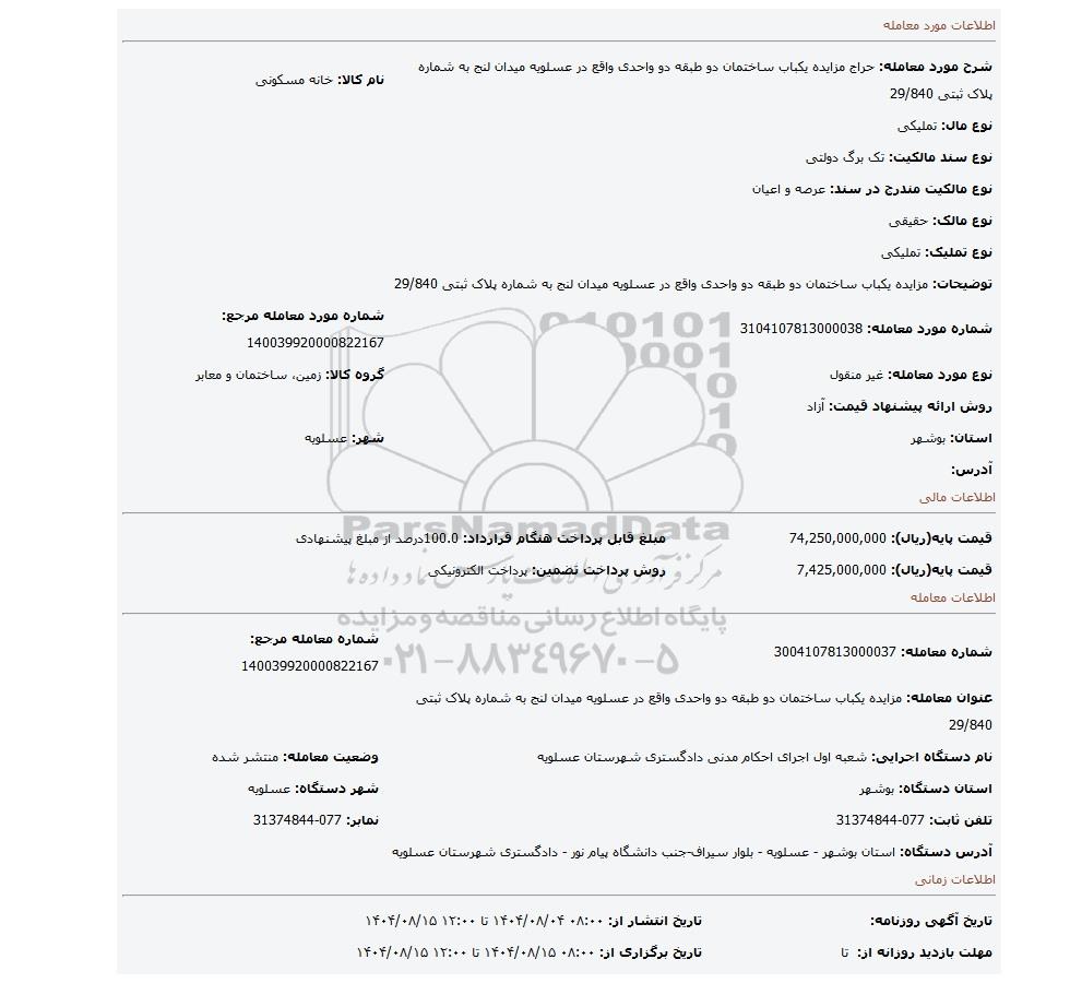 | عنوان معامله: مزایده یکباب ساختمان دو طبقه دو واحدی واقع در عسلویه میدان لنج به شماره پلاک ثبتی 29/840 | ||