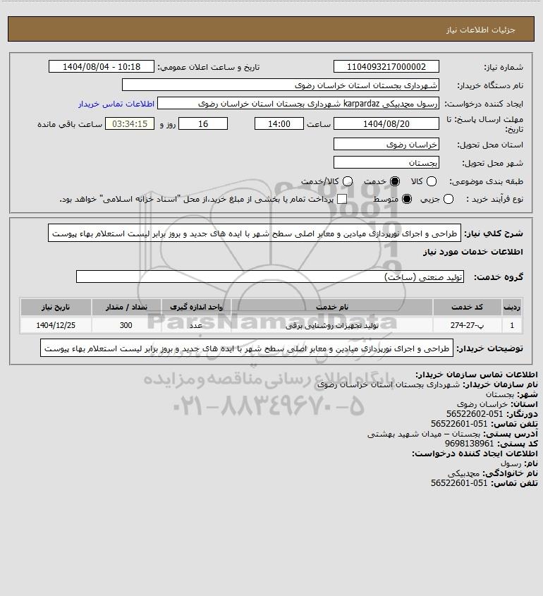 شرح کلی نیاز: طراحی و اجرای نورپردازی میادین و معابر اصلی سطح شهر با ایده های جدید و بروز برابر لیست استعلام بهاء پیوست