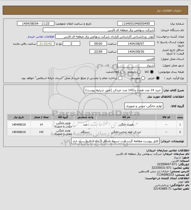 نام دستگاه خریدار:شرکت سهامی برق منطقه ای فارس