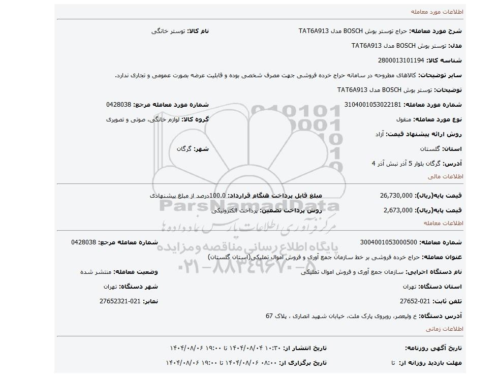 عنوان معامله: حراج خرده فروشی بر خط سازمان جمع آوری و فروش اموال تملیکی(استان گلستان)
