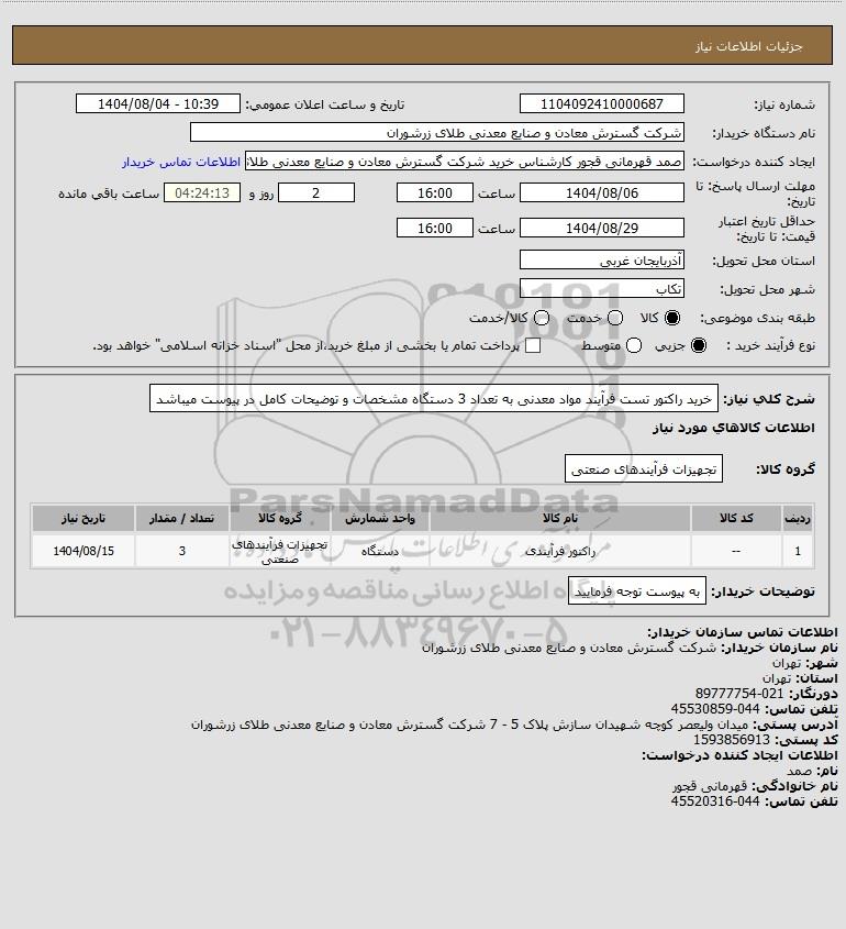 نام دستگاه خریدار:شرکت گسترش معادن و صنایع معدنی طلای زرشوران