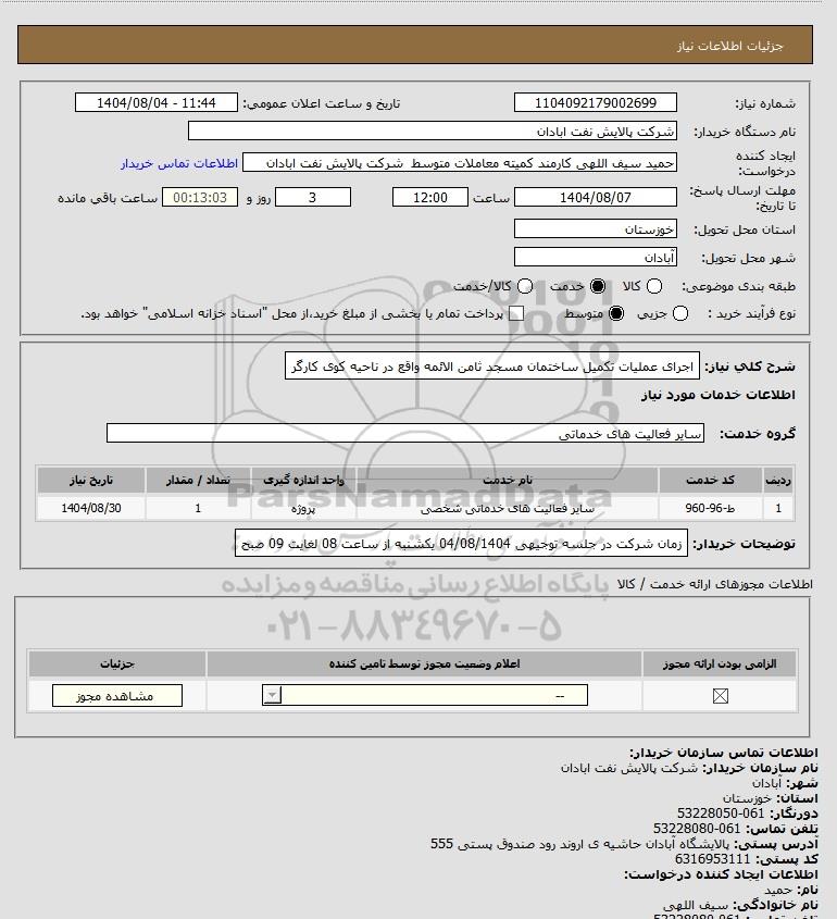 شرح کلی نیاز: اجرای عملیات تکمیل ساختمان مسجد ثامن الائمه واقع در ناحیه کوی کارگر