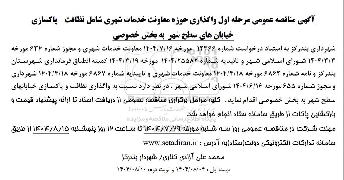 شهرداری بندرگز به استناد درخواست شماره 12366 مورخه 1404.7.16 معاونت خدمات شهری و مجوز شماره 634 مورخه 1404.3.3 شورای اسلامی شهر و تائیدیه شماره 1404.25582 مورخه 1404.3.19 کمیته انطباق فرمانداری شهرستان بندرگز و نامه شماره 6862 مورخه 1404.4.18 معاونت خدمات شهری و تاییدیه شماره 6867 مورخه 1404.4.18 شهرداری و مجوز شماره 655 مورخه 1404.6.16 شورای اسلامی شهر، در نظر دارد نسبت به واگذاری نظافت و پاکسازی خیابانهای سطح شهر به بخش خصوصی اقدام نماید. کلیه مراحل برگزاری مناقصه عمومی از دریافت اسناد تا ارائه پیشنهاد قیمت و بازگشایی پاکات از طریق سامانه ستاد انجام خواهد شد.