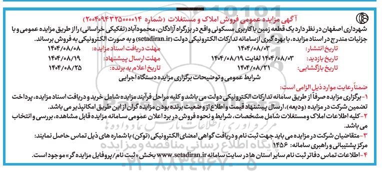 شهرداری اصفهان در نظر دارد یک قطعه زمین با کاربری مسکونی واقع در بزرگراه آزادگان، محمود آباد (تفکیکی خراسانی) را از طریق مزایده عمومی و با جزئیات مندرج در اسناد مزایده، با بهره گیری از سامانه تدارکات الکترونیکی دولت ستاد ایران و به صورت الکترونیکی به فروش برساند.