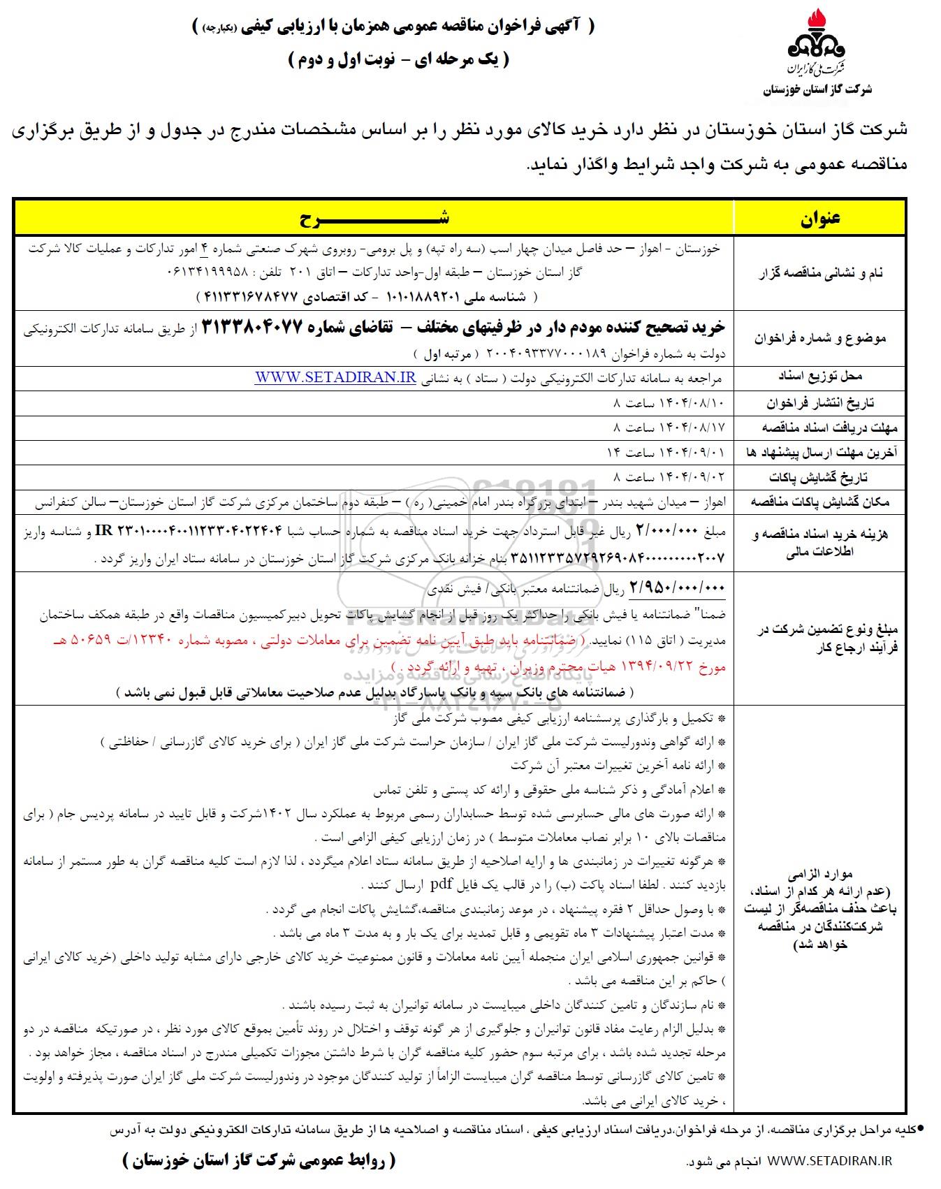 شرکت گاز استان خوزستان در نظر دارد خرید کالای مورد نظر را بر اساس مشخصات مندرج در جدول و از طریق برگزاری مناقصه عمومی به شرکت واجد شرایط واگذار نماید.
