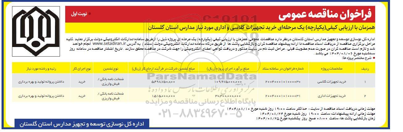 فراخوان مناقصه عمومی همزمان با ارزیابی کیفی (یکپارچه) یک مرحله ای خرید تجهیزات کلاسی و اداری مورد نیاز مدارس استان گلستان