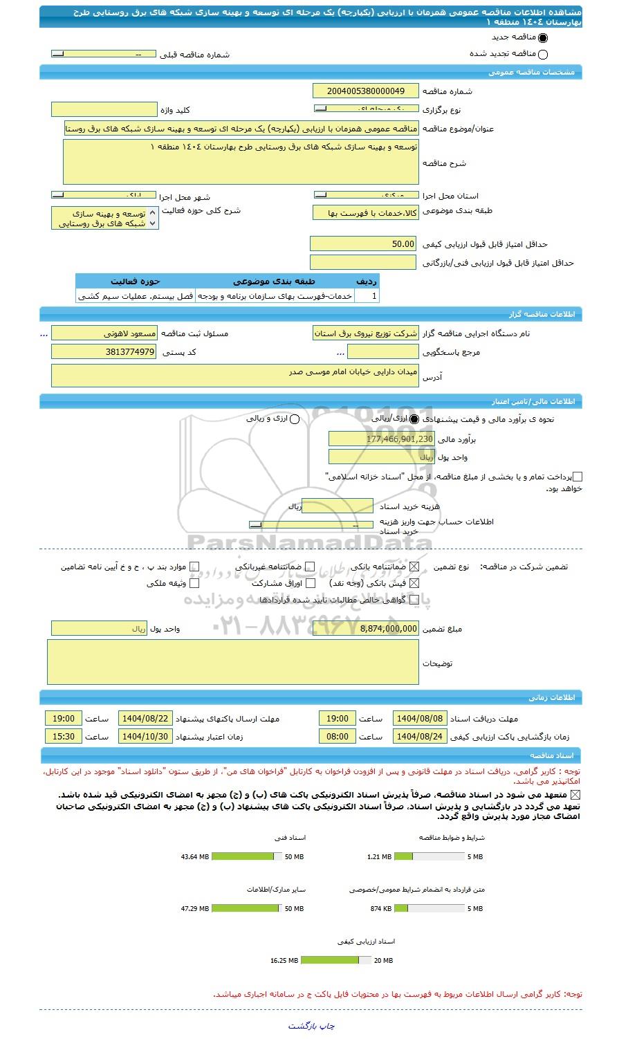 مناقصه مناقصه عمومی همزمان با ارزیابی (یکپارچه) یک مرحله ای توسعه و بهینه سازی شبکه های برق روستایی طرح بهارستان ١٤٠٤ منطقه ١ از کلیه افراد متخصص و شرکت‌ها واجد شرایط دعوت به عمل می‌آید در مناقصه با کد خبرگزاری پارس نماد: 9753449 شرکت نمایند. این مناقصه در تاریخ 1404/08/04 شروع و مهلت آن تا تاریخ 1404/08/08 میباشد.