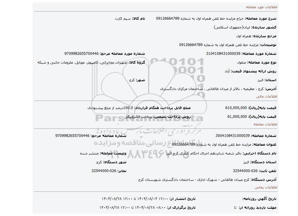 | شرح مورد معامله: حراج مزایده خط تلفن همراه اول به شماره 09126664789 | نام کالا: سیم کارت | |