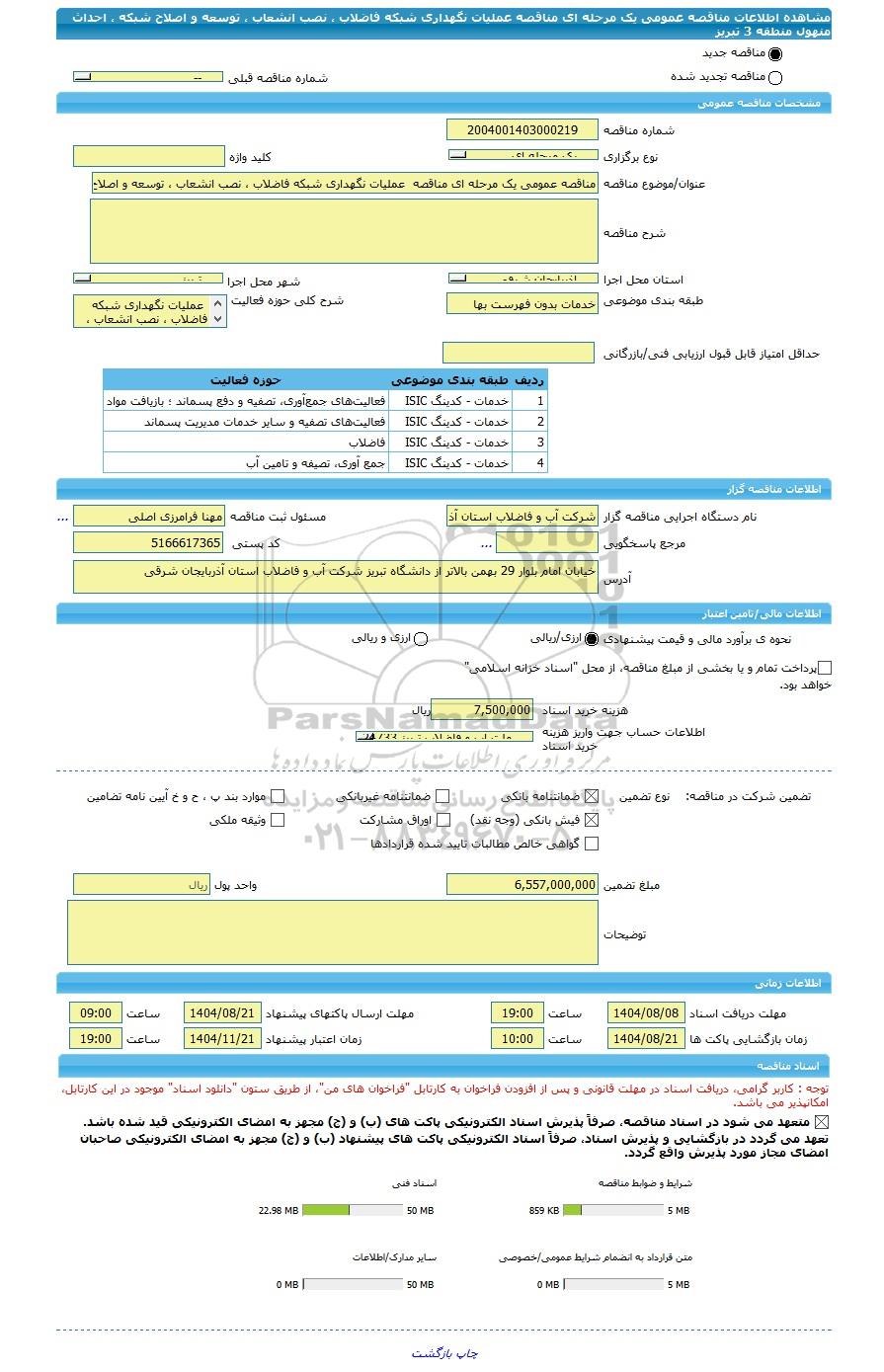 | زمان بازگشایی پاکت ها | 1404/08/21 | تا تاریخ | 10:00 | زمان اعتبار پیشنهاد | 1404/11/21 | تا ساعت | 19:00 |
