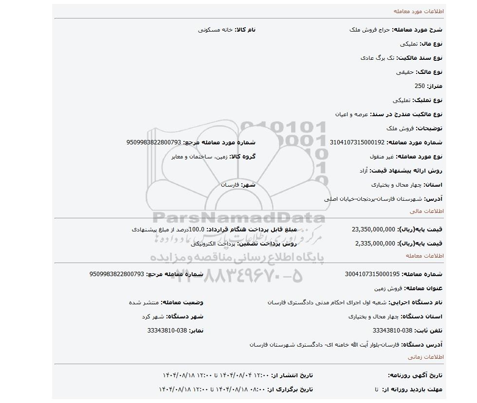 | شماره مورد معامله: 3104107315000192 | شماره مورد معامله مرجع: 9509983822800793 | |