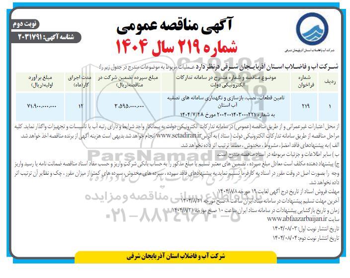 | 1 | 219 | تامین قطعات، نصب، بازسازی و نگهداری سامانه های تصفیه آب استان به شماره 2004001403000221 مورخ 1404.7.28 |
