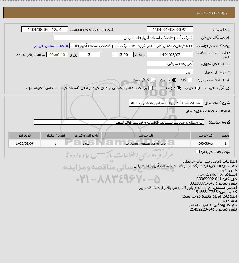 شرح کلی نیاز: عملیات ایستگاه پمپاژ آبرسانی به شهر خامنه