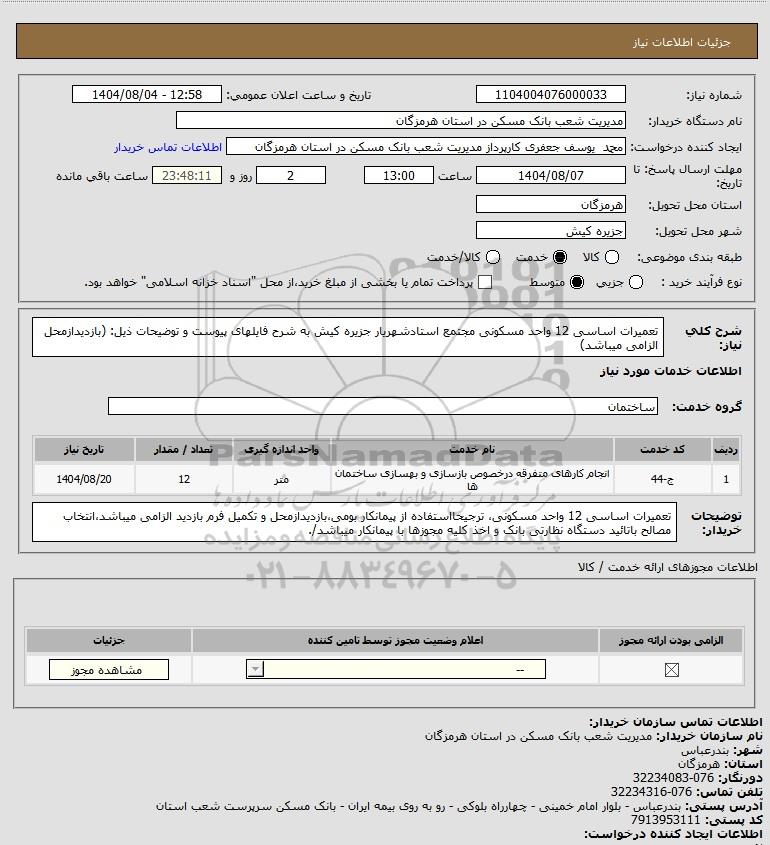 توضیحات خریدار:تعمیرات اساسی 12 واحد مسکونی، ترجیحااستفاده از پیمانکار بومی،بازدیدازمحل و تکمیل فرم بازدید الزامی میباشد،انتخاب مصالح باتائید دستگاه نظارتی بانک و اخذ کلیه مجوزها با پیمانکار میباشد/.