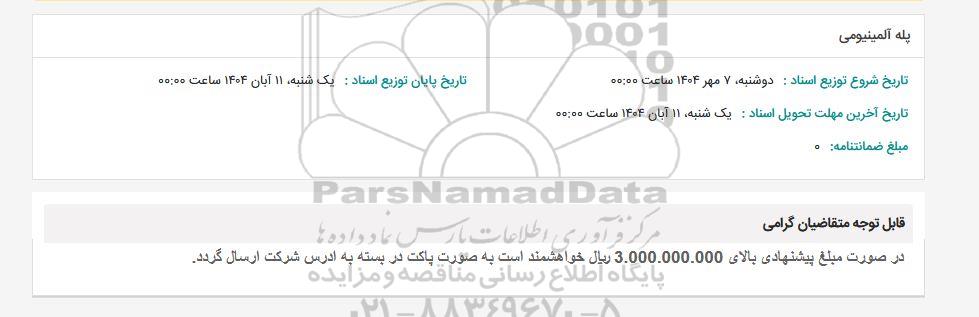 نحوه دریافت اسناد و ارسال پیشنهاد: متقاضیان میتوانند با ثبت نام در سامانه مناقصات و مزایدات ایران (پارس نماد) نسبت به مشاهده اسناد استعلام، دریافت اطلاعات تکمیلی، و ثبت پیشنهاد قیمت خود اقدام نمایند. در صورت نیاز به دریافت راهنمایی یا پشتیبانی در خصوص استعلام و مناقصه و فراخوان مناقصه عمومی، مناقصه محدود، مناقصه بین المللی، مناقصه دولتی، مناقصه خصوصی، مناقصه آنلاین فروش تجهیزات، مناقصه مشاورهای مناقصه پتروشیمی و انرژی مناقصه صنایع و تجهیزات برق و مخابرات و نفت و گاز ... لطفاً با سایت خبری مناقصه و مزایده پارسنماد دادهها به شماره 88349670 تماس حاصل فرمایید.
