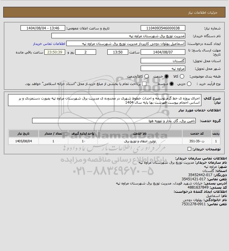شرح کلی نیاز: اجرای پروژه ی خط گرم توسعه و احداث خطوط شهری در محدوده ی مدیریت برق شهرستان مراوه تپه بصورت دستمزدی و بر اساس احجام پیوست فهرست بها پایه سال 1404