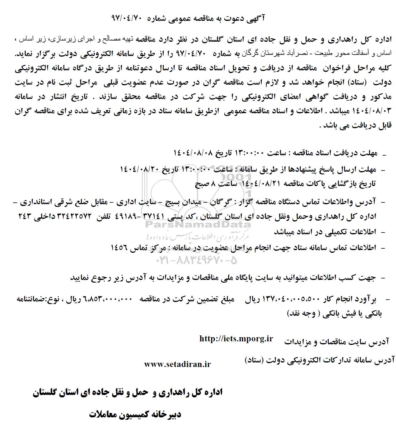 اداره کل راهداری و حمل و نقل جاده ای استان گلستان در نظر دارد مناقصه تهیه مصالح و اجرای زیرسازی، زیراساس، اساس و آسفالت محور طبیعت - نصرآباد شهرستان گرگان به شماره 97/04/70 را از طریق سامانه الکترونیکی دولت برگزار نماید. کلیه مراحل فراخوان مناقصه از دریافت و تحویل اسناد مناقصه تا ارسال دعوتنامه از طریق درگاه سامانه الکترونیکی دولت (ستاد) انجام خواهد شد و لازم است مناقصه گران در صورت عدم عضویت قبلی مراحل ثبت نام در سایت مذکور و دریافت گواهی امضای الکترونیکی را جهت شرکت در مناقصه محقق سازند. تاریخ انتشار در سامانه 1404.08.03 میباشد. اطلاعات و اسناد مناقصه عمومی از طریق سامانه ستاد در بازه زمانی تعریف شده برای مناقصه گران قابل دریافت می باشد .