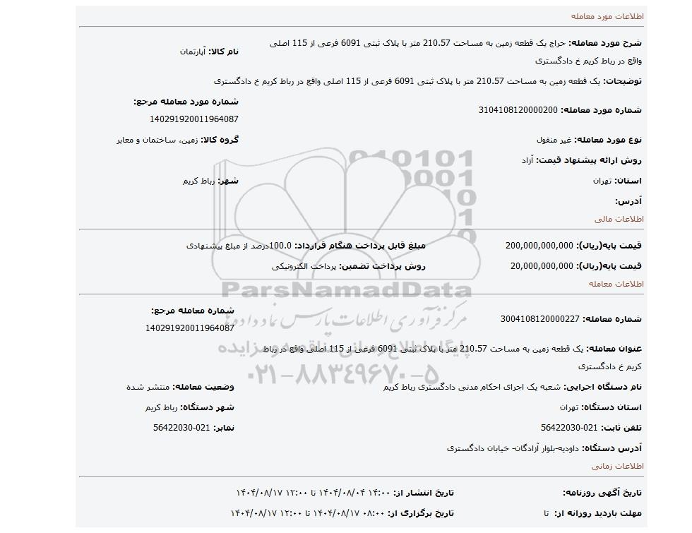 | شرح مورد معامله: حراج یک قطعه زمین به مساحت 210.57 متر با پلاک ثبتی 6091 فرعی از 115 اصلی واقع در رباط کریم خ دادگستری | نام کالا: آپارتمان | |