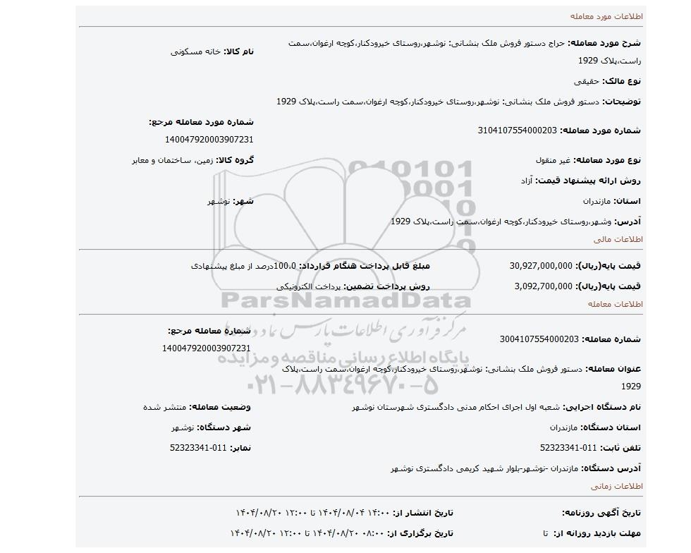 | شرح مورد معامله: حراج دستور فروش ملک بنشانی: نوشهر،روستای خیرودکنار،کوچه ارغوان،سمت راست،پلاک 1929 | نام کالا: خانه مسکونی | |