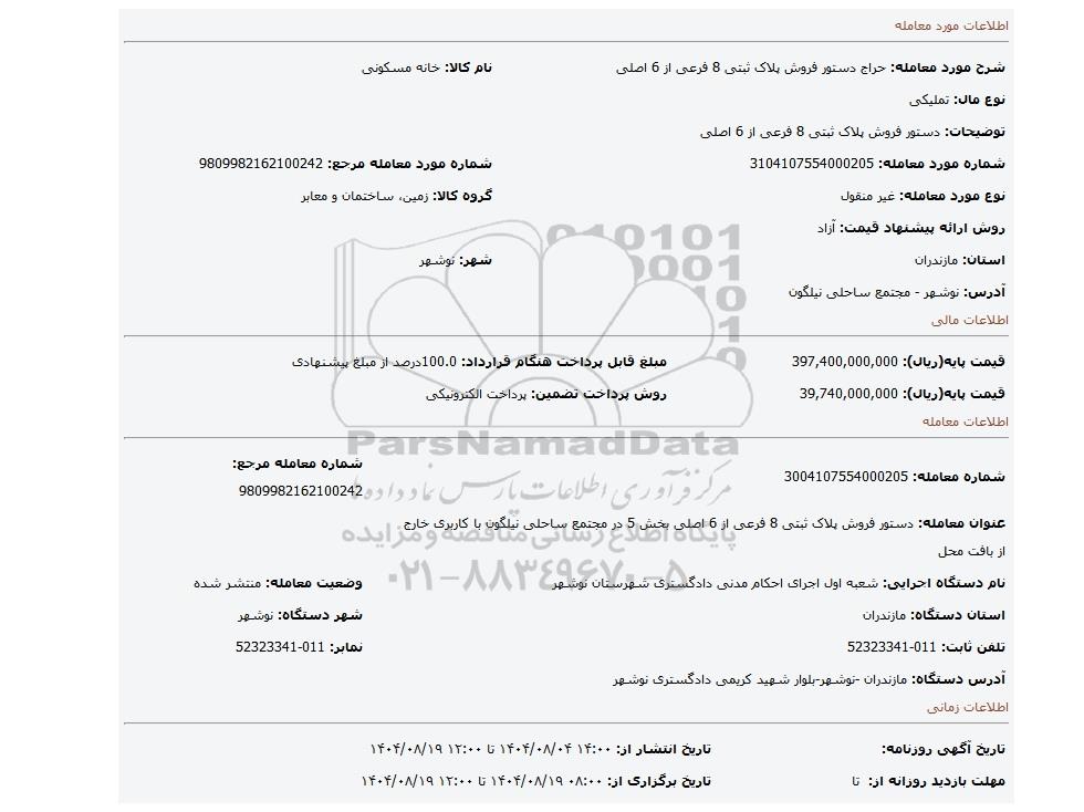 | شماره مورد معامله: 3104107554000205 | شماره مورد معامله مرجع: 9809982162100242 | |
