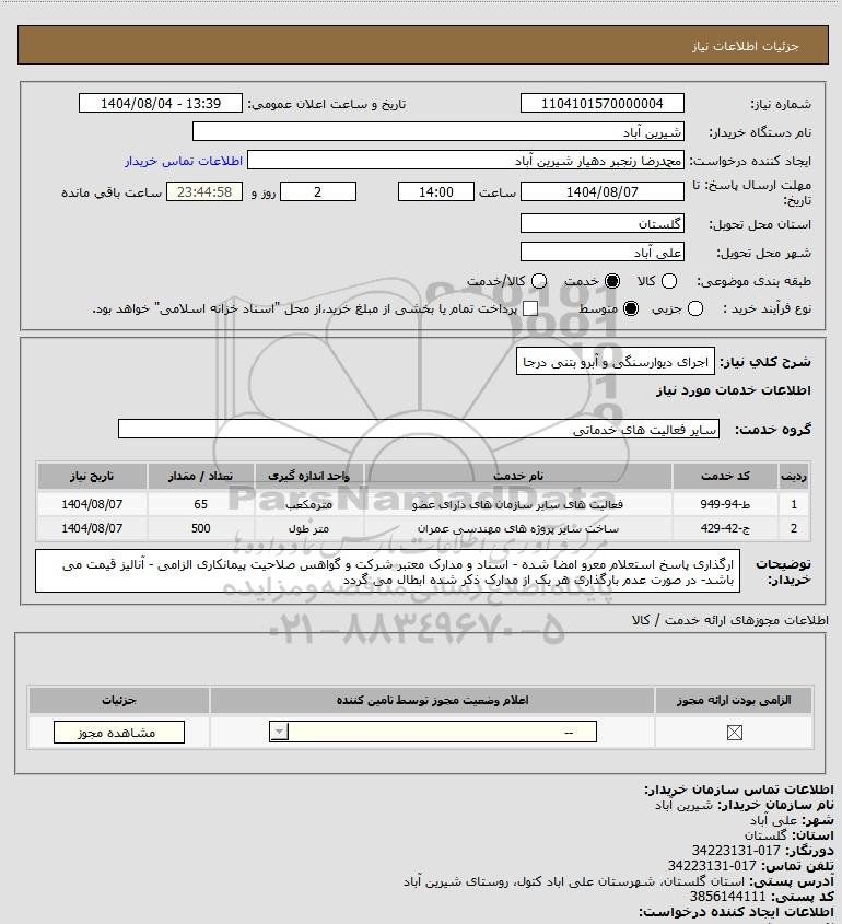 شرح کلی نیاز: اجرای دیوارسنگی و آبرو بتنی درجا