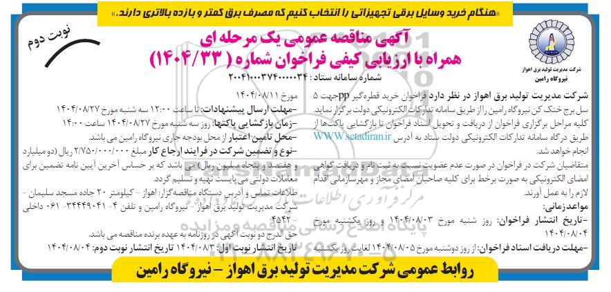 آگهی مناقصه عمومی یک مرحله ای همراه با ارزیابی کیفی فراخوان شماره (1404.33) نوبت دوم؟