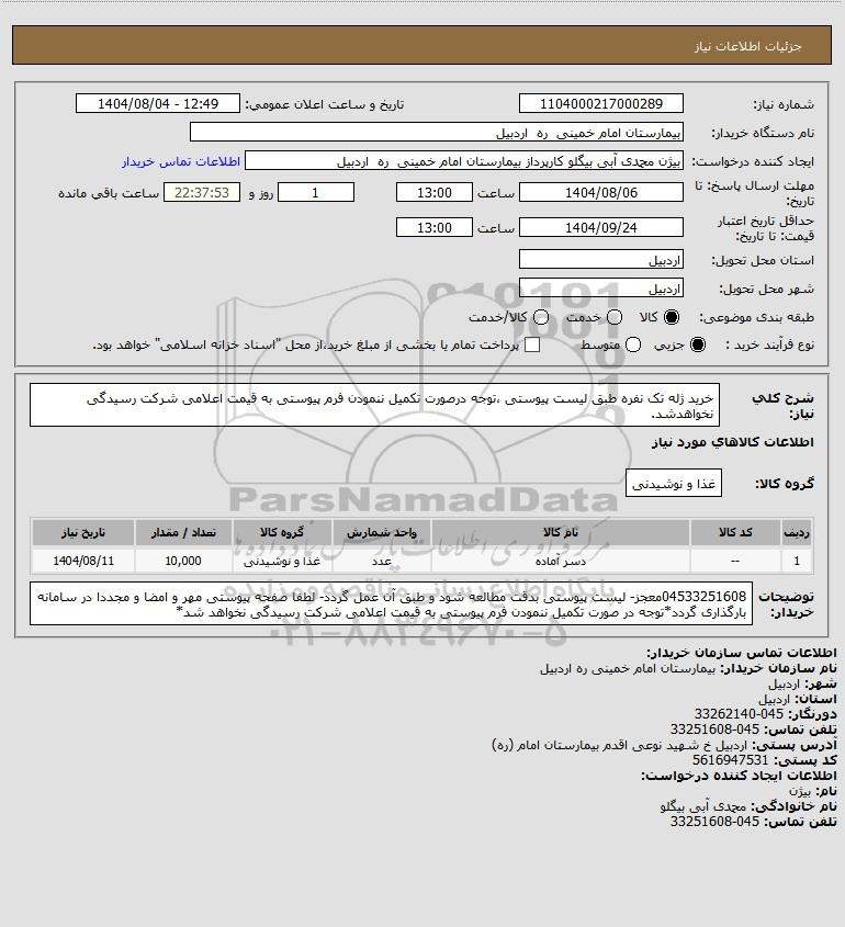 استعلام بها و موضوع استعلام استعلام خرید ژله تک نفره طبق لیست پیوستی ،توجه درصورت تکمیل ننمودن فرم پیوستی به قیمت اعلامی شرکت رسیدگی نخواهدشد. به اطلاع کلیه شرکت‌ها و افراد متخصص واجد شرایط می‌رساند، آگهی گذار در نظر دارد از طریق استعلام بها، نسبت به انتخاب و دریافت پیشنهادات اقدام نماید. این استعلام با کد آگهی ثبت شده در سامانه خبرگزاری پارس نماد : 9754540 منتشر شده است. مشخصات استعلام : تاریخ شروع استعلام: 1404/08/04 آخرین مهلت ارسال پیشنهاد قیمت : 1404/08/06 و محل اجرای پروژه : استان اردبیل میباشد. استعلام قیمت مورد درخواست : استعلام خرید ژله تک نفره طبق لیست پیوستی ،توجه درصورت تکمیل ننمودن فرم پیوستی به قیمت اعلامی شرکت رسیدگی نخواهدشد. با دسته‌بندی‌های تخصصی و گروه های مرتبط : مواد غذایی, استعلام اطلاع رسانی میگردد.