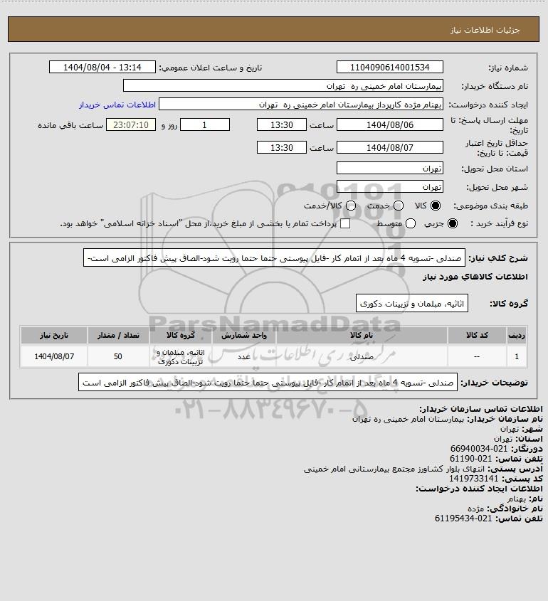 شرح کلی نیاز: صندلی -تسویه 4 ماه بعد از اتمام کار -فایل پیوستی حتما حتما رویت شود-الصاق پیش فاکتور الزامی است-