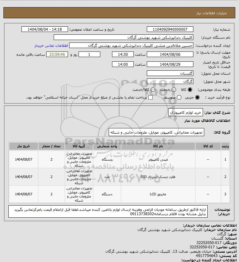 | 3 | -- | مانیتور LCD | دستگاه | تجهیزات مخابراتی، کامپیوتر، موبایل، ملزومات جانبی و شبکه | 2 | 1404/08/07 |