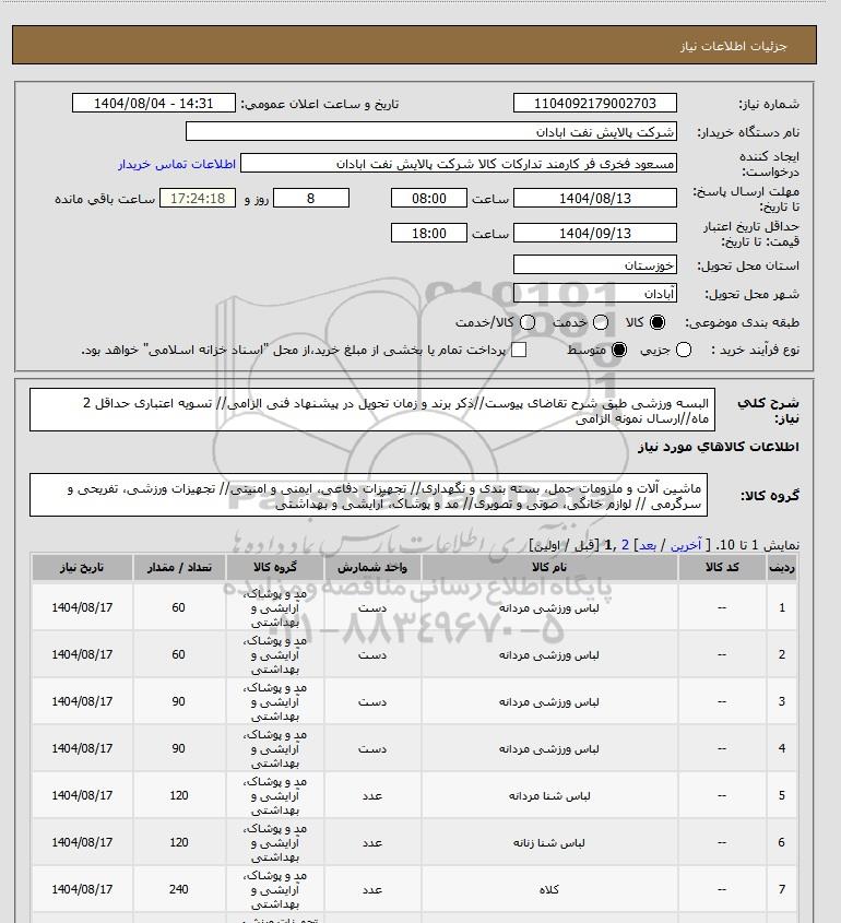 شرح کلی نیاز: البسه ورزشی طبق شرح تقاضای پیوست//ذکر برند و زمان تحویل در پیشنهاد فنی الزامی// تسویه اعتباری حداقل 2 ماه//ارسال نمونه الزامی