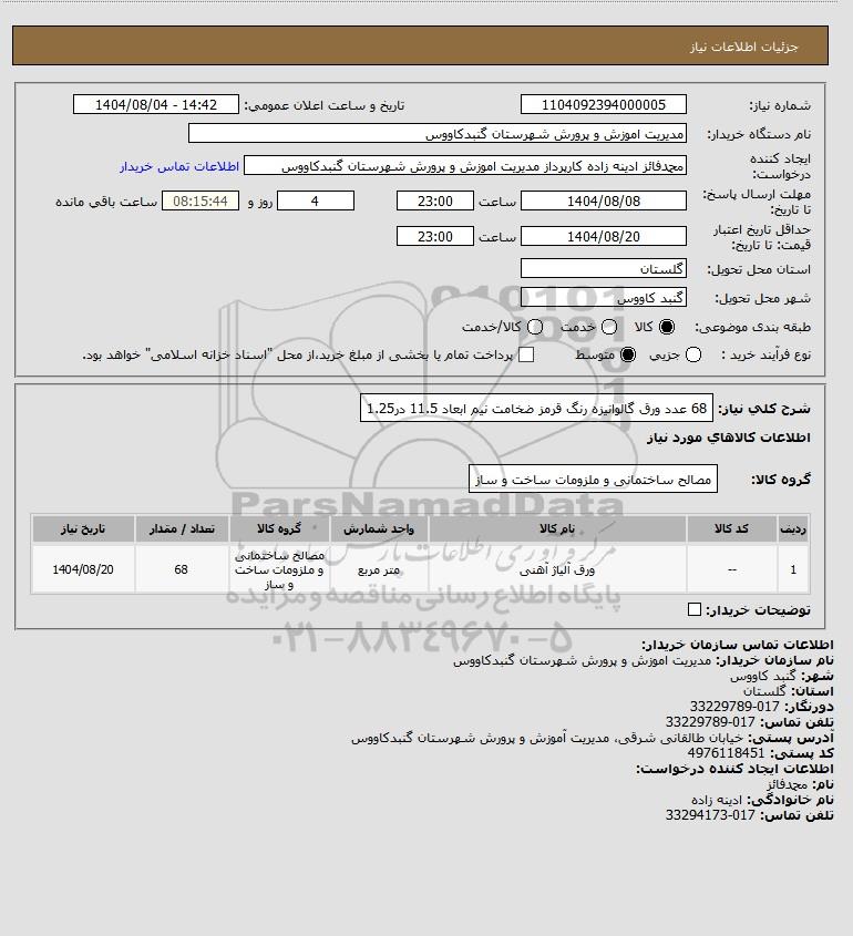 شرح کلی نیاز: 68 عدد ورق گالوانیزه رنگ قرمز ضخامت نیم ابعاد 11.5 در1.25