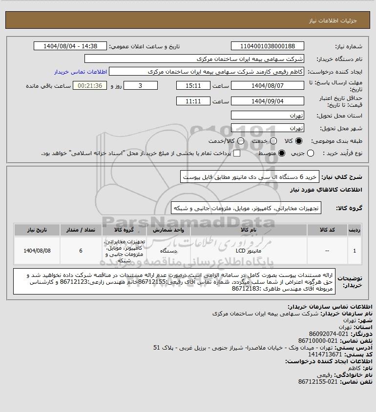 شرح کلی نیاز: خرید 6 دستگاه ال سی دی مانیتور مطابق فایل پیوست