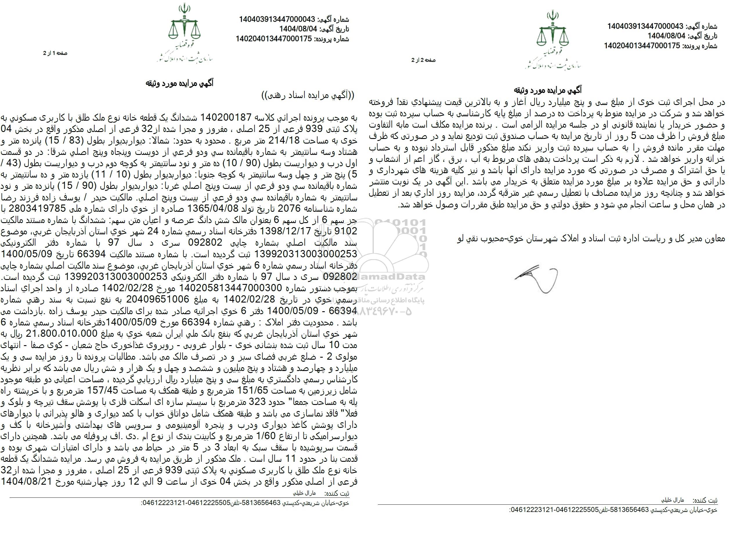 به موجب پرونده اجرائی کلاسه 140200187 ششدانگ یک قطعه خانه نوع ملک طلق با کاربری مسکونی به پلاک ثبتی 939 فرعی از 25 اصلی ، مغرور و مجرا شده از 32 فرعی از اصلی مذکور واقع در بخش 04 خوی به مساحت 214.18 متر مربع . محدود به حدود شمالا دیوار بدیوار بطول 83 . 15 پانزده متر و هشتاد و سه سانتیمتر به شماره باقیمانده سی و دو فرعی از دویست و پنجاه وینج اصلی شرقا در دو قسمت اول درب و دیوار پست بطول (90 . 10) ده متر و نود سانتیمتر به کوچه دوم درب و دیواریست بطول (43) (5) پنج متر و چهل و سه سانتیمتر به کوچه جنوبا دیوار بدیوار بطول (10) . (11) یازده متر و ده سانتیمتر به شماره باقیمانده سی و دو فرعی از بیست وپنج اصلی غربا دیوار بدیوار بطول 90 . 15 پانزده متر و نود سانتیمتر به شماره باقیمانده سی و دو فرعی از بیست و پنج اصلی مالكیت حیدر . یوسف زاده فرزند رضا شماره شناسنامه 2076 تاریخ تولد 1365.04.08 صادره از خوی دارای شماره ملی 2803419785 با جر سهم 6 از کل سهم 6 بعنوان مالک شش دانگ عرصه و اعیان متن سهم ششدانگ با شماره مستند مالکیت 9102 تاریخ 1398.12.17 دفترخانه اسناد رسمی شماره 24 شهر خوی استان آذربایجان غربی، موضوع سند مالکیت اصلی بشماره چایی 092802 سری در سال 97 با شماره دفتر الکترونیکی 1400.05.09 139920313003000253 ثبت گردیده است. با شماره مستند مالکیت 66394 تاریخ دفترخانه اسناد رسمی شماره 6 شهر خوی استان آذربایجان غربی موضوع سند مالکیت اصلی بشماره جایی 092802 سری در سال 97 با شماره دفتر الکترونیکی 139920313003000253 ثبت گردیده است. بموجب دستور شماره 140205813447000300 مورخ 1402.02.28 صادره از واحد اجرای اسناد رسمی خوی در تاریخ 1402.02.28 به مبلغ 20409651006 به نفع نسبت به سند رهنی شماره 66394 - 1400.05.09 دفتر 6 خوی اجرائیه صادر شده برای مالکیت حیدر یوسف زاده بازداشت می باشد. محدودیت دفتر املاک : رهنی شماره 66394 مورخ 1400.05.09 دفترخانه اسناد رسمی شماره 6 شهر خوی استان آذربایجان غربی که بنفع بانک ملی ایران شعبه خوی به مبلغ 21.800.010.000 ریال به مدت 10 سال ثبت شده بنشانی خوی - بلوار غروبی - روبروی غذاخوری حاج شعبان - کوی صفا - انتهای مولوی 2 - ضلع غربی فضای سبز و در تصرف مالک می باشد. مطالبات پرونده تا روز مزایده سی و یک میلیارد و چهارصد و هشتاد و پنج میلیون و ششصد و چهل و یک هزار و شش ریال می باشد که برابر نظریه کارشناس رسمی دادگستری به مبلغ سی و پنج میلیارد ریال ارزیابی گردیده، مساحت اعیانی دو طبقه موجود شامل زیرزمین به مساحت 151.65 متر مربع و طبقه همکف به مساحت 157.45 متر مربع و با خریشته راه پله به مساحت جمعا حدود 323 متر مربع با سیستم سازه ای اسکلت فلزی با پوشش سقف تیرچه و بلوک و فعلا فاقد نماسازی میباشد و طبقه همکف شامل دو اتاق خواب با کمد دیواری و قالو پذیرانی با دیوارهای دارای پوشش کاغذ دیواری و درب و پنجره آلومینیومی و سرویسهای بهداشتی و آشپزخانه با کف و دیوار سرامیکی تا ارتفاع 1.60 متر مربع و کابینت بندی از نوع ام دی اف پروفیله می باشد. همچنین دارای قسمت سرپوشیده با سقف سبک به ابعاد 3 در 5 متر در حیاط میباشد و دارای امتیازات شهری بوده و قدمت بنا در حدود 11 سال است . ملک مذکور از طریق مزایده به فروش می رسد. مزایده ششدانگ یک قطعه خانه نوع ملک طلق با کاربری مسکونی به پلاک ثبتی 939 فرعی از 25 اصلی، مغرور و مجرا شده از 32 فرعی از اصلی مذکور واقع در بخش 04 خوی از ساعت 9 الی 12 روز چهارشنبه مورخ 1404.08.21 در محل اجرای ثبت خوی از مبلغ سی و پنج میلیارد ریال آغاز و به بالاترین قیمت پیشنهادی نقدا فروخته خواهد شد و شرکت در مزایده منوط به پرداخت ده درصد از مبلغ پایه کارشناسی به حساب سپرده ثبت بوده و حضور خریدار با نماینده قانونی او در جلسه مزایده الزامی است. برنده مزایده مکلف است مابه التفاوت مبلغ فروش را ظرف مدت 5 روز از تاریخ مزایده به حساب صندوق ثبت تودیع نماید و در صورتی که ظرف مهلت مقرر مانده فروش را به حساب سپرده ثبت واریز نکند مبلغ مذکور قابل استرداد نبوده و به حساب خزانه واریز خواهد شد. لازم به ذکر است پرداخت بدهی های مربوط به آب ، برق ، گاز اعم از انشعاب و یا حق اشترا