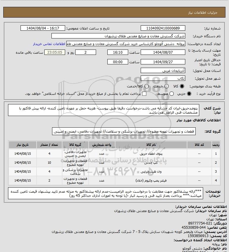 نام دستگاه خریدار:شرکت گسترش معادن و صنایع معدنی طلای زرشوران
