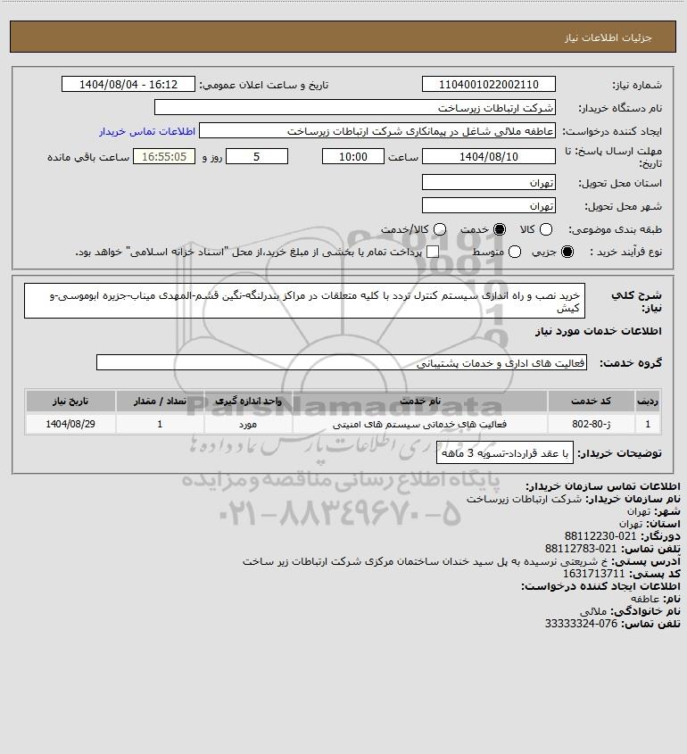 شرح کلی نیاز: خرید نصب و راه اندازی سیستم کنترل تردد با کلیه متعلقات در مراکز بندرلنگه-نگین قشم-المهدی میناب-جزیره ابوموسی-و کیش