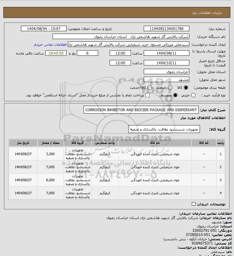 شرح کلی نیاز: CORROSION INHIBITOR AND BIOCIDE PACKAGE AND DISPERSANT