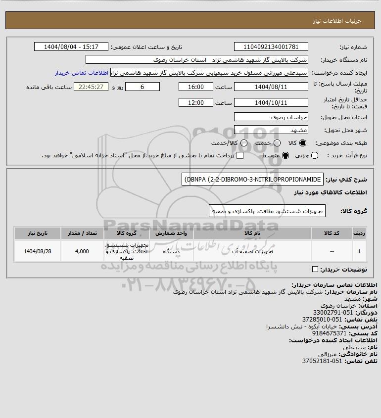 شرح کلی نیاز: DBNPA (2-2-DIBROMO-3-NITRILOPROPIONAMIDE)