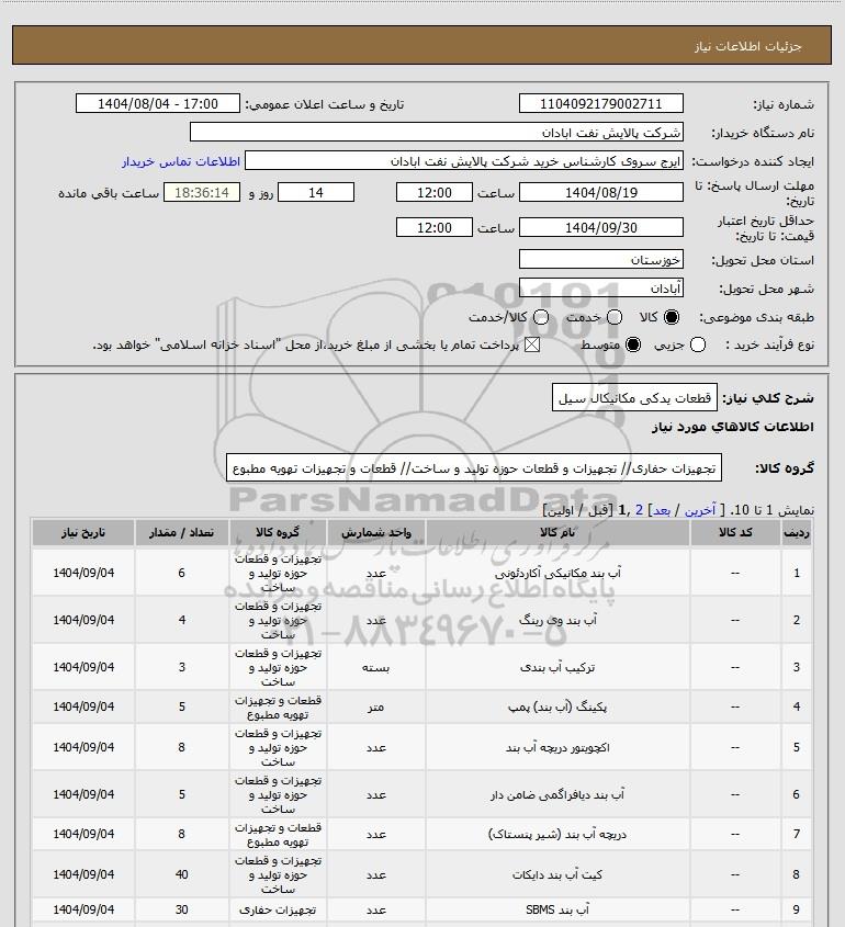 | 9 | -- | آب بند SBMS | عدد | تجهیزات حفاری | 30 | 1404/09/04 |