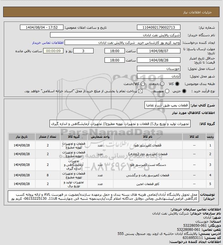 | 1 | -- | قطعات کمپرسور هوا | عدد | قطعات و تجهیزات تهویه مطبوع | 2 | 1404/08/28 |