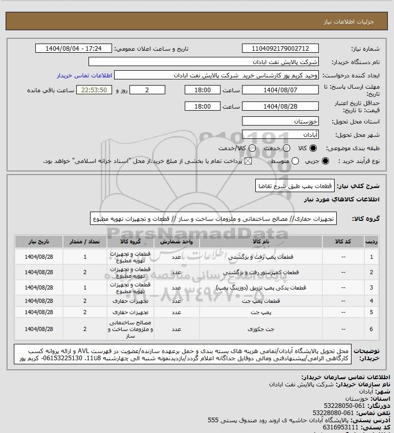 استعلام قطعات پمپ طبق شرح تقاضا, استعلام قطعات پمپ طبق شرح تقاضا