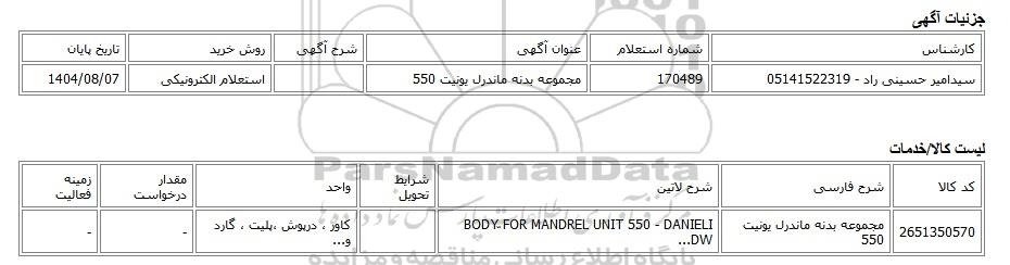 | سیدامیر حسینی راد - 05141522319 | 170489 | مجموعه بدنه ماندرل یونیت 550 | استعلام الکترونیکی | 1404/08/07 |