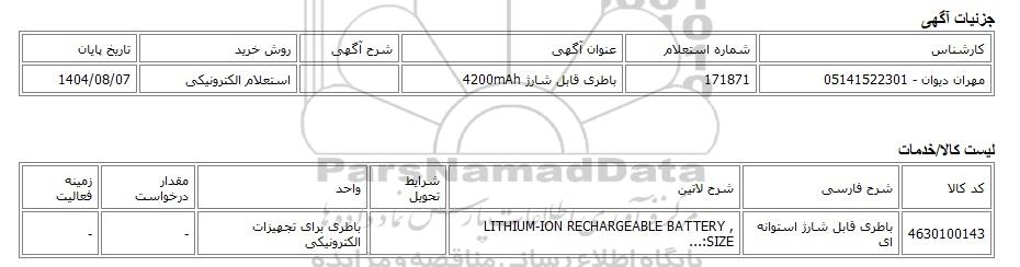 مهران دیوان - 05141522301171871باطری قابل شارژ 4200mAhاستعلام الکترونیکی1404/08/07