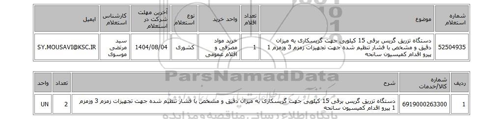 | 52504935 | دستگاه تزریق گریس برقی 15 کیلویی جهت گریسکاری به میزان دقیق و مشخص با فشار تنظیم شده جهت تجهیزات زمزم 3 وزمزم 1 پیرو اقدام کمیسیون سانحه | 1 | خرید مواد مصرفی و اقلام عمومی | کشوری | 1404/08/04 | سید مرتضی موسوی | SY.MOUSAVI@KSC.IR |