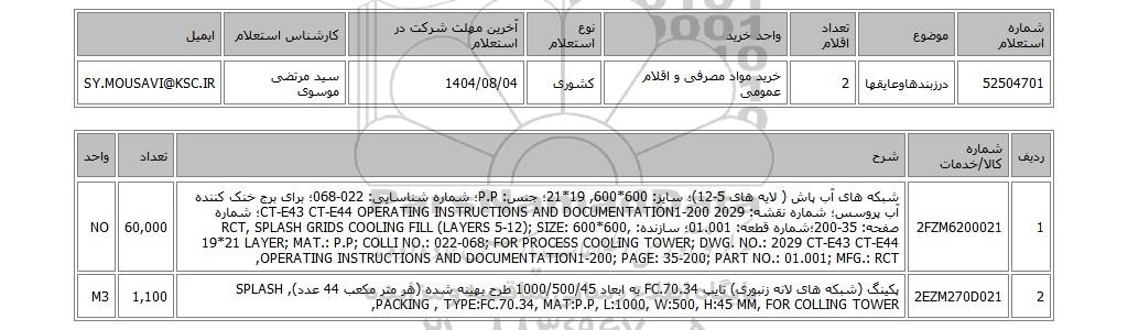 | 52504701 | درزبندهاوعایقها | 2 | خرید مواد مصرفی و اقلام عمومی | کشوری | 1404/08/04 | سید مرتضی موسوی | SY.MOUSAVI@KSC.IR |