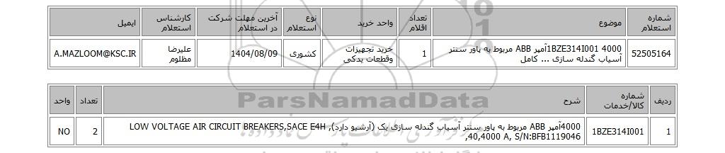 | 52505164 | 1BZE314I001 4000آمپر ABB مربوط به پاور سنتر آسیاب گندله سازی ... کامل | 1 | خرید تجهیزات وقطعات یدکی | کشوری | 1404/08/09 | علیرضا مظلوم | A.MAZLOOM@KSC.IR |